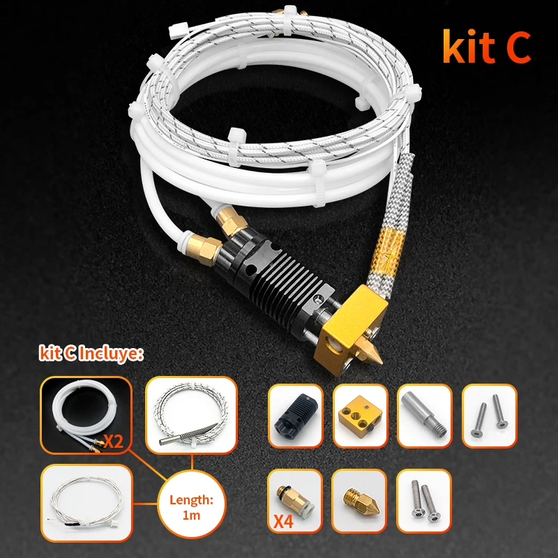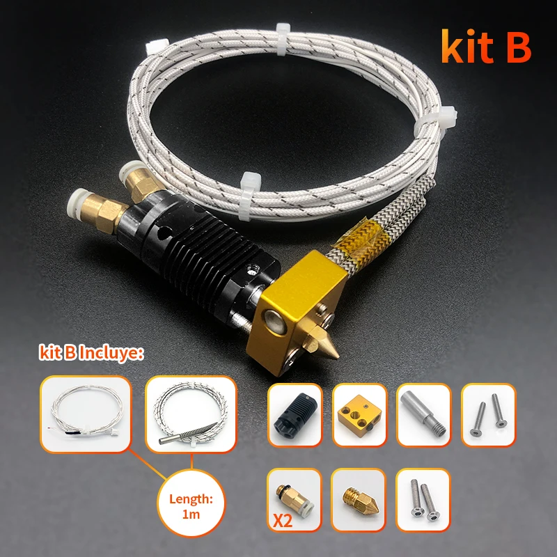 3D Printer Parts 2 IN 1 OUT Hotend Kit Dual Extruder Set Heated Etruder Double Color Printing for Ender 3 CR-10 Dropshipping Pecification: Model: MK-8-T Material: Aluminum + Stainless Steel + Brass Voltage: 24V 40W Resistance R (25°C) = 100k±1% In and out: two in and one out Connection method: external connection Cable length: 1.2 M Nozzle: 0.4mm Working temperature: 270°C Application: 3D printer Size: 8 * 2.5 * 2.2cm / 3.1 * 1.0 * 0.9in Net weight: 76g Gross weight: 85g Descriptions: 1. 0.4mm nozzle; 1.75 filament size; aluminum heating block; heater wire 12V/24V. 2. 2 in 1 out two-color printing nozzle kit, suitable for DIY gantry layout upgrade and transformation, such as ENDER3 series and TEVO, ALFWISE, etc. 3. Two types of filaments can be accessed, switched between the two inputs when printing, and extruded through the hot end. 4. Color switching is fast and stable, and the print quality has no obvious defects. 5. The heating block and the radiator are connected and fixed by two screws to make the print head more stable. 100% brand new and high quality.
