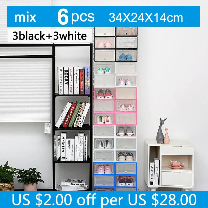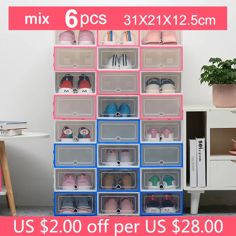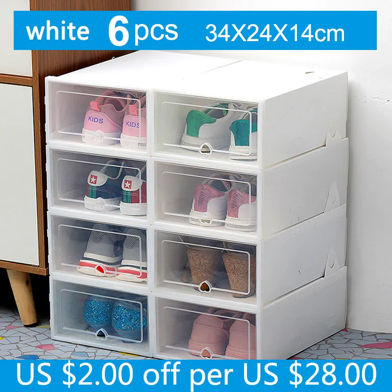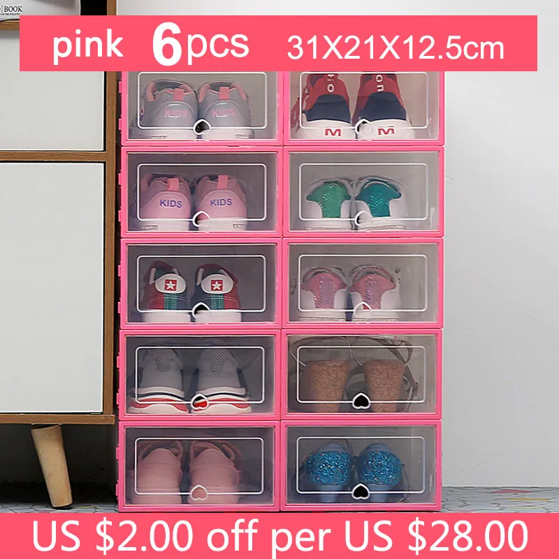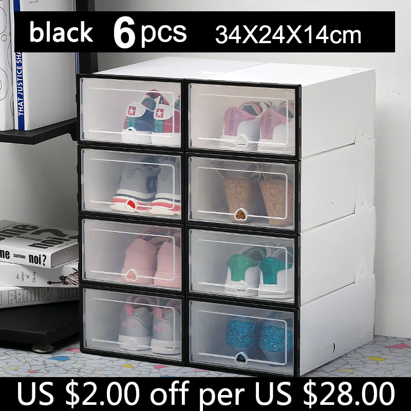 please choose correct warhouse so that you can get goods fast. Set of 6 | 6pcs 1 order 6 ps Transparent shoe box dustproof storage box can be superimposed combination shoe cabinet Clamshell men and women shoe box desktop storage shoebox 2 size avilable : 31*21*12.5 cm | 34*24*14 cm Material: Plastic (PP) | Weight: 450g | Color: white ,black ,pink |