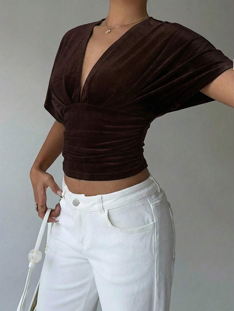 Pattern Type:Plain Sleeve Type:Batwing Sleeve Hem Shaped:Tight Hem Lined For Added Warmth:No Festivals:Commencement/Graduation Season Color:Navy Blue Details:Asymmetrical, Backless, Ruched Style:Casual Occasion:Night Out Neckline:Deep V Neck Sleeve Length:Cap Sleeve Length:Crop Fit Type:Slim Fit Fabric Elasticity:Medium Stretch Material:Knitted Fabric Composition:91% Polyester, 5% Viscose, 4% Elastane Care Instructions:Hand wash or professional dry clean Sheer:No |