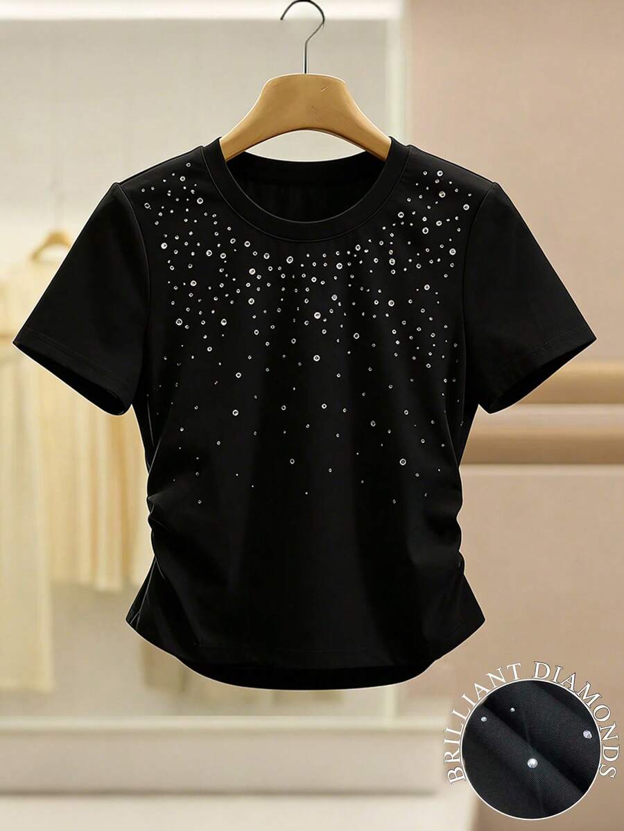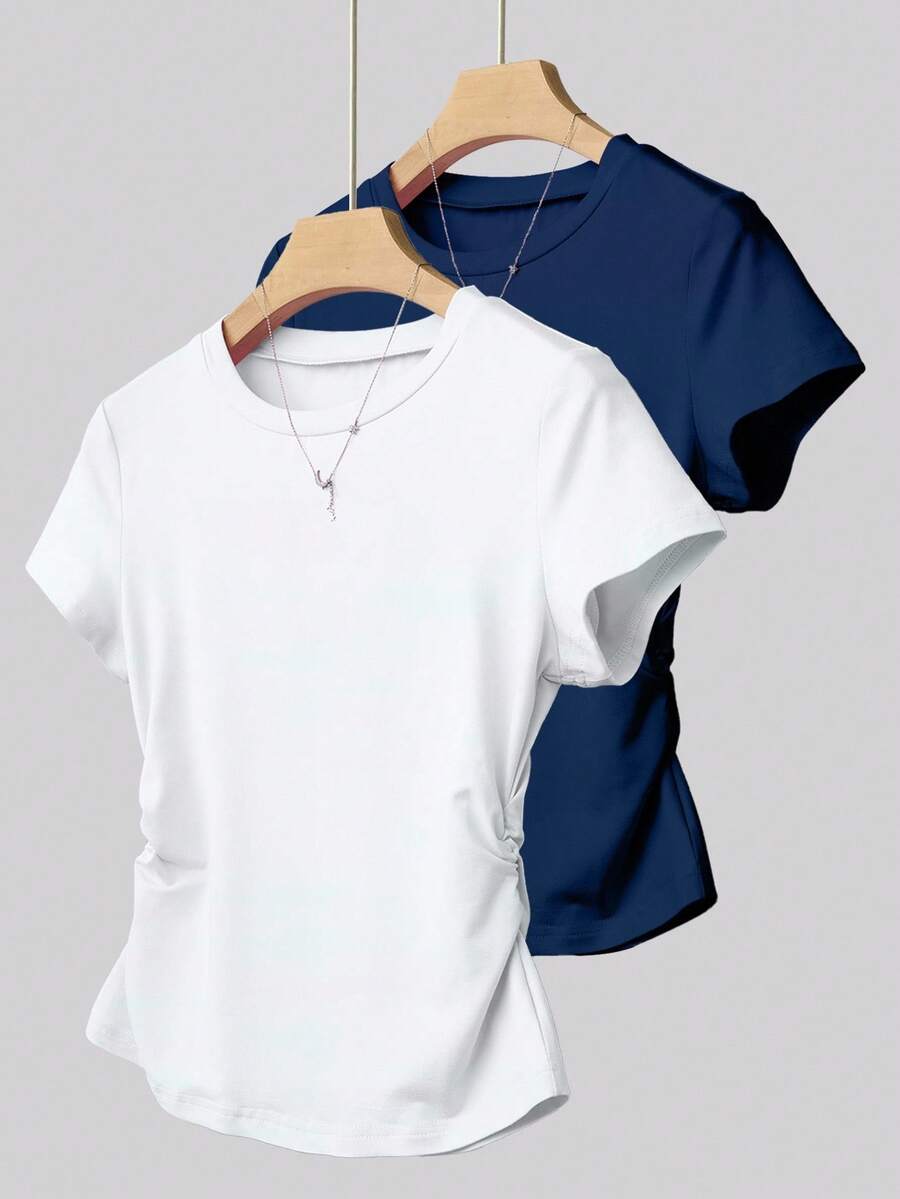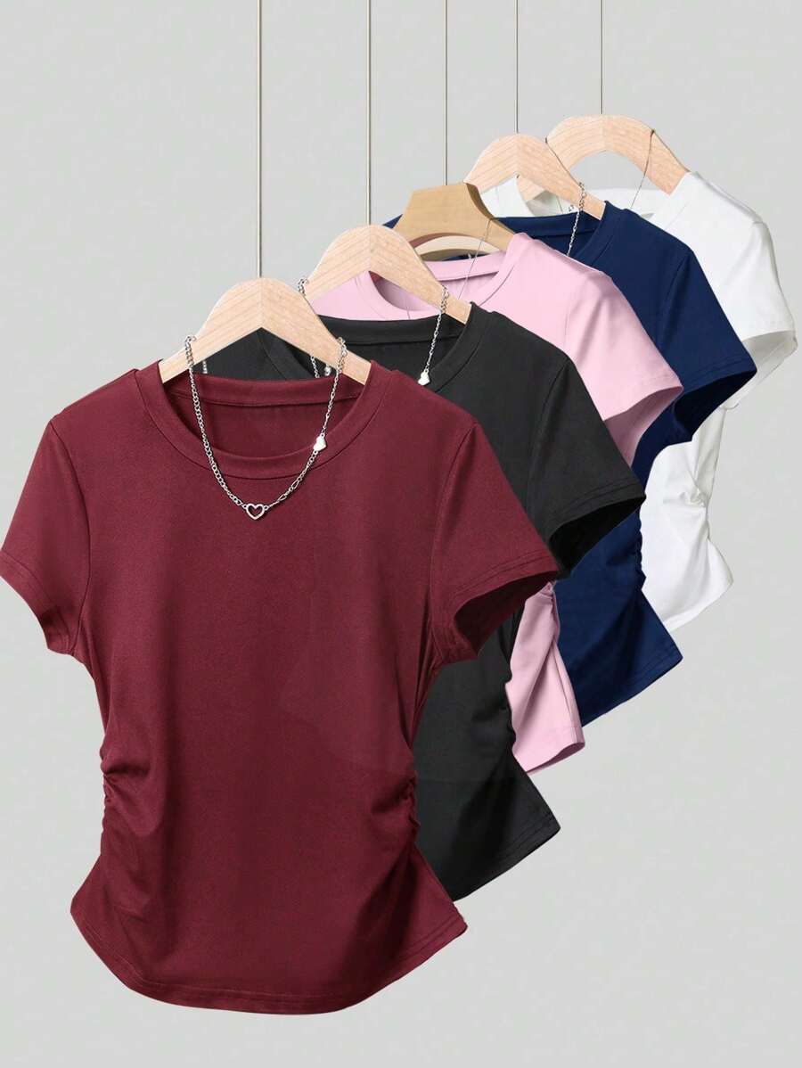 Pattern Type:Plain Sleeve Type:Regular Sleeve Hem Shaped:Regular Lined For Added Warmth:No Color:Multicolor Details:Ruched Style:Casual Occasion:Travel Neckline:Round Neck Sleeve Length:Short Sleeve Length:Regular Fit Type:Regular Fit Fabric Elasticity:Slight Stretch Material:Knitted Fabric Composition:95% Polyester, 5% Elastane Care Instructions:Machine wash or professional dry clean Sheer:No |