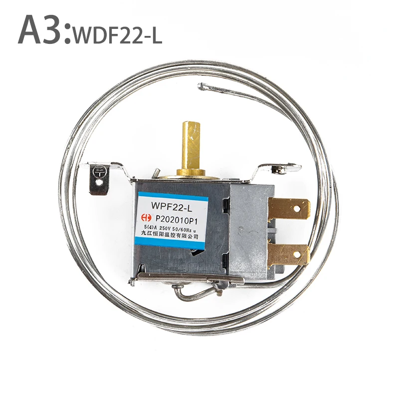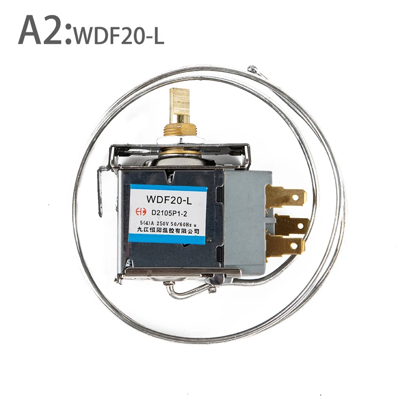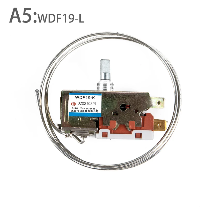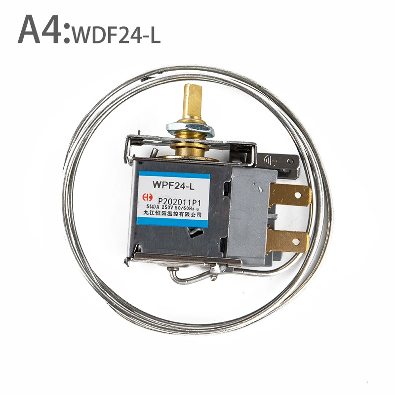 Description: WDF18-L/WDF20-L/WDF19-K/WPF22-L/WPF24-LRefrigerator Thermostat This refrigerator thermostat ideal replace for your damaged thermostat, features D shaped shaft. Control the temperature of refrigerator, display cabinet, congealer, beverage cooler and similar product. Easy to operate manual controls Used for hotel, bar, car, vehicle, apartment, villa and other places. Specification: Working Voltage: AC 250V Current: 4A/5A, 50Hz/60Hz Warm In: -1℃ to -9℃ Warm Out: -20℃ to 25℃ Terminals: 2 Material: Metal, Plastic Dimensions: approx. 5.4x2.5x5.6cm(2.13x0.98x2.20in) Cord Length: approx. 85cm(33.46in) Color: As pictures shown. WDF18-L,WDF19-K,WDF20-L are suitable for Refrigerator ,WPF22-L ,WPF24-L are suitable for Freezer Package inlcudes:1pc