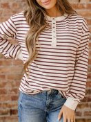 Acelitt Spring Casual Women\\\'s Red Dahlia Striped Printed Off Shoulder Long Sleeved Henley Top | Lotusrite.comPattern Type:Striped Sleeve Type:Drop Shoulder Hem Shaped:Regular Lined For Added Warmth:No Festivals:Back-to-School, Commencement/Graduation Season... |
