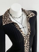 Elamini Polo Collar Deep V Leopard Print Contrast Color Casual Commute Vintage Women Tight Knit Fleece Ribbed Long Sleeve Casual