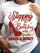 Women\\\'s Round Neck T-Shirt With \\\"Walk Into My Birthday With God\\\'s Grace And Mercy\\\" Religious Faith Birthday Theme Gl