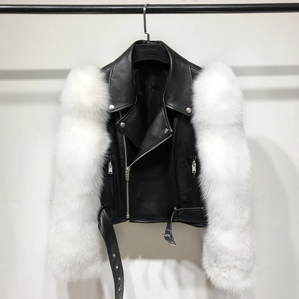 Yoloagain Women Real Silver Fox Fur Sleeve Crocodile Pattern Genunie Leather Jacket Short - Genuine Leather - Officematics