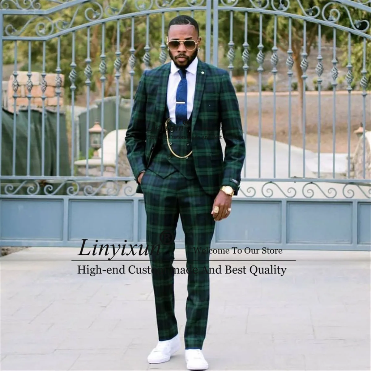 Casual Dark Green Plaid Mens Suit Formal Business Slim Fit Blazer Wedding Groom 3 Piece Set Terno Masculino (Jackets+Vest+Pants)  81005003062466963
