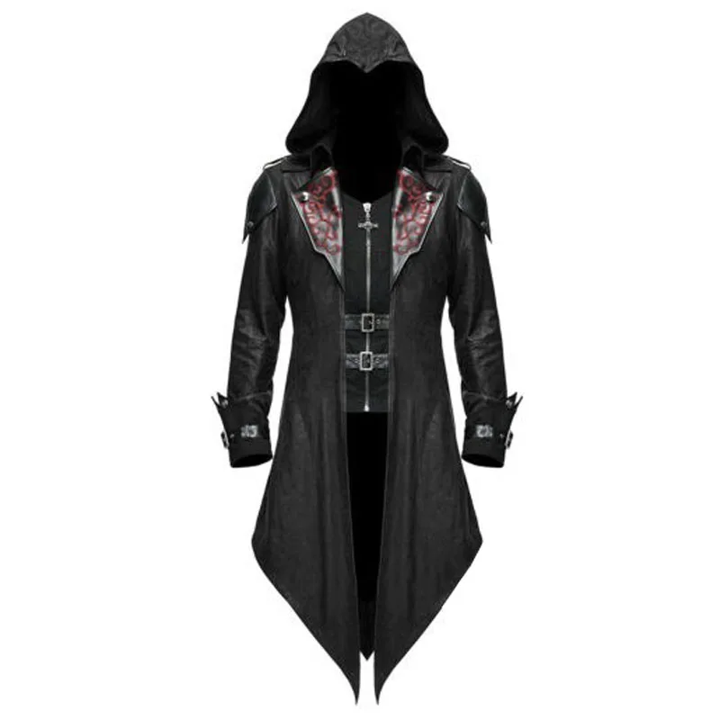 Steampunk Gothic Tuxedo Trench Coat Turn-Down Collar Hooded Leather Dovetail Jacket Assassin Costume Halloween For Men Plus SizeSize Data
