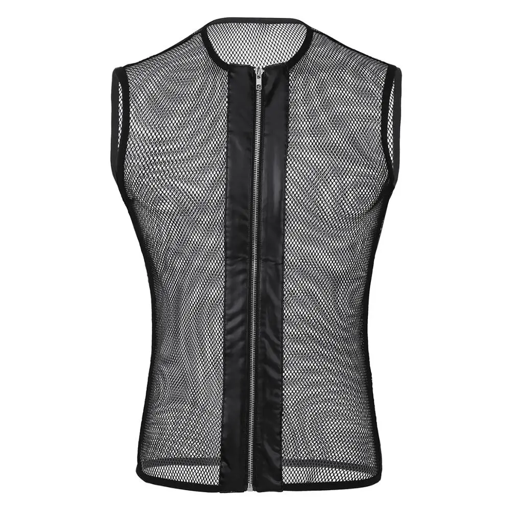 Summer See-through Mesh Men Undershirt Sleeveless Fishnet T Shirt Tops Lingerie Transparent Underwear Front Zipper Breathable Sexy Tops Set Include: 1x T-Shirt